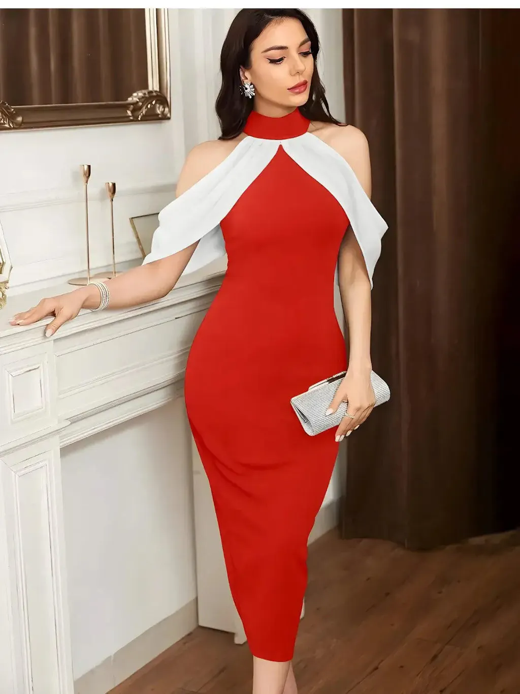 The striking red base is enhanced with graceful white cape-style sleeves that create a dramatic yet classy look. The cold-shoulder design paired with a high neckline adds a modern and sophisticated touch, making this dress perfect for parties, cocktail evenings, dinners, or special celebrations.